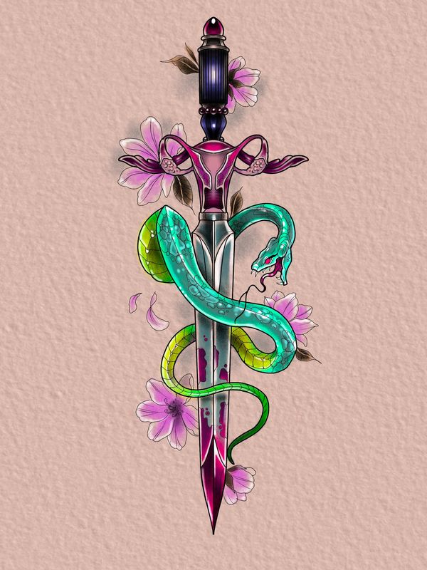 You can find the voucher for the "Serpent and Dagger" design as seen on TikTok (Exhibit_Ash). By purchasing the voucher you are getting an artist's permission voucher, the original linework, and color swatches. The voucher is an instant download so make sure your correct email is attached to your Etsy account.